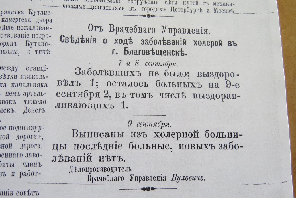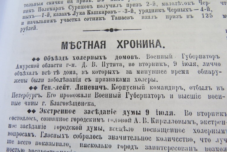 Впервые холера вспыхнула в области в 1894 году, тогда было 54 заболевших, трое умерли. Самоуправление Благовещенска действовало решительно. Первым делом был сформирован отряд дезинфекторов (один фельдшер и четыре санитара). В бывших переселенческих бараках возле городской больницы (западная часть города) открыли холерное отделение, в помещении бывшей мельницы Соколова (восточная часть города) организовали городскую холерную больницу. Одну тысячу рублей выделили на оборудование новых ассенизационных телег, 300 рублей - на постройку общественных туалетов (их тогда называли ретирадами). Главной проблемой города было отсутствие водопровода. Из местной тюрьмы канализационная труба проходила мимо базарных площадей и попадала в Амур, где люди массово забирали воду для питьевых целей - о каком качестве могла идти речь?! Санитарный врач того времени Бенедиктович издал постановление, в котором прописал, что населению настоятельно рекомендовано пить только кипяченую воду.