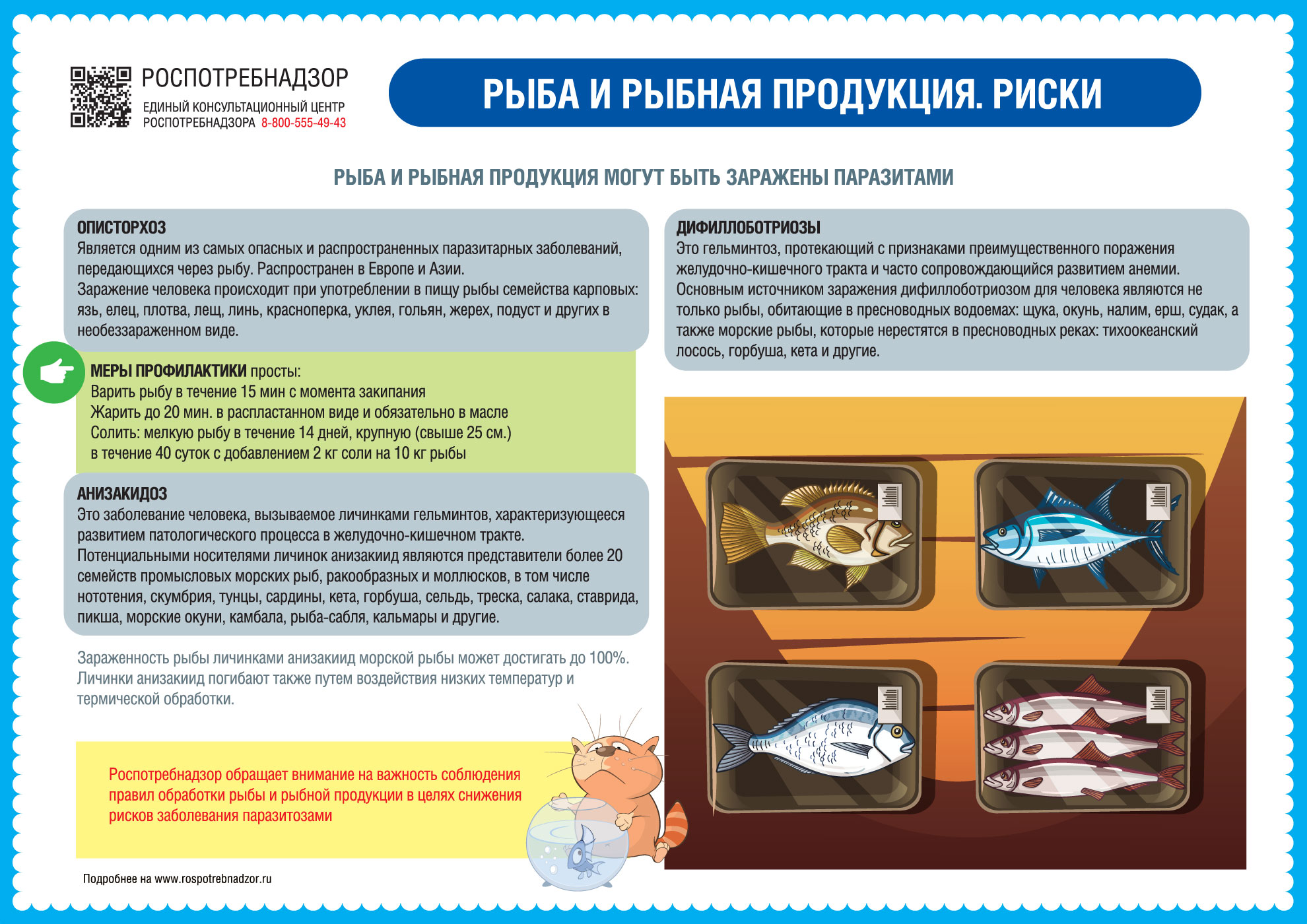 Роспотребнадзор обращает внимание на важность соблюдения правил обработки рыбы и рыбной продукции в целях снижения рисков заболевания паразитозами. Следует помнить, что рыба и рыбная продукция могут быть заражены паразитами. Наиболее распространенными являются описторхоз, клонорхоз, дифиллоботриозы, анизакидозы.