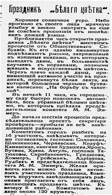 Ординатор Благовещенской городской больницы Адольф Карлович Перлин, во время научной командировки в «Европейскую Россию и в Европу» (сентябрь 1910 г. – май 1911 г.) в Москве познакомился с новыми методами лечения чахотки и борьбы с нею. Вполне вероятно, что он наблюдал первый День белого цветка в России, а, может, и участвовал в нём.