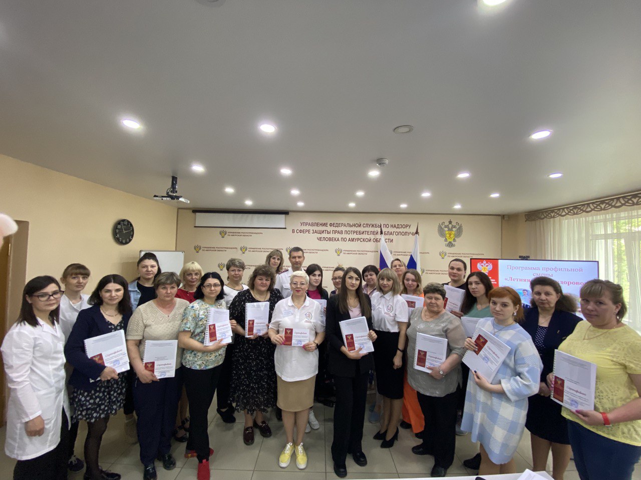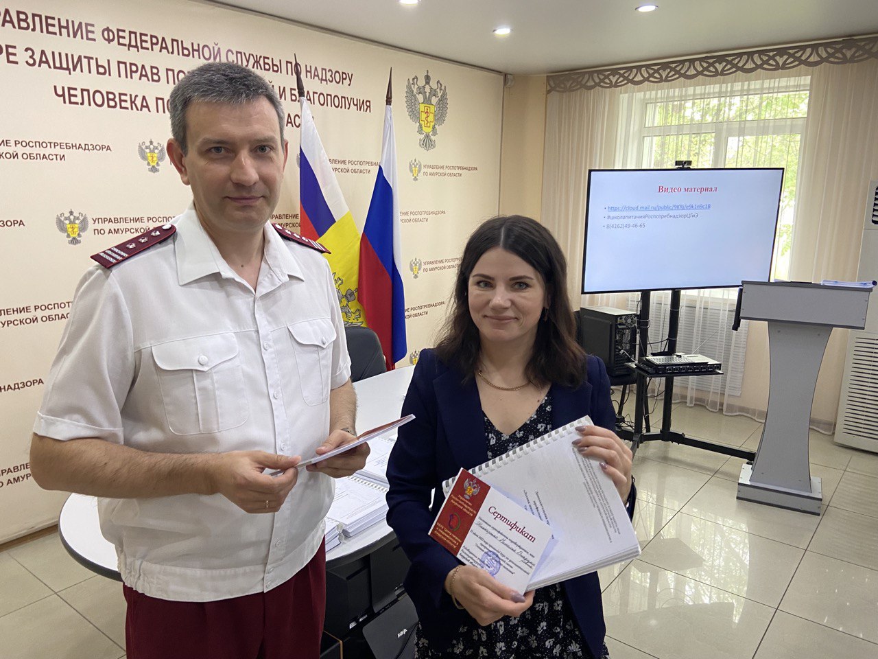Как определяется половина дневной нормы соли в двух сосисках, как отличить мясной продукт и мясосодержащего, как выглядят канцерогены из растительного масла в пробирке и кишечная палочка под микроскопом, а такжемногое другое вредоносное, с чем мы ежедневно сталкиваемся, но не видим, показали сотрудники Роспотребнадзора сотрудникам летних оздоровительных смен пришкольных лагерей. Ранее мы рассказывали, что запускаем «Школу здорового питания» для детей, и воспитатели и педагоги пришли к нам на семинар, чтобы получить полезную информацию, которую мы совместно будем показывать и рассказывать ребятам этим летом. Химические опыты и выступления наших сотрудников вызвали большой интерес взрослых. Мы убеждены, что дети будут от них ещё в большем восторге. Ну а мы достигнем поставленной цели – выработать у них полезные пищевые привычки, которыми ребята, вернувшись со смен, поделятся с родителями. А это значит, что в семьях амурчан будет уделено больше внимание здоровому и полезному питанию, а значит красоте и долголетию. По окончании семинара участники получили сертификаты Роспотребнадзора о прохождении обучения, а также большое количество необходимых для работы материалов, которые будут применяться в ходе работы летних смен.