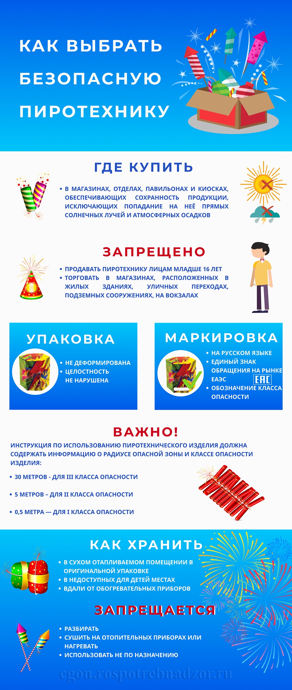 В преддверии Нового года, празднование которого сопровождается использованием фейерверков и новогодних салютов, Роспотребнадзор обращает внимание на правила покупки и эксплуатации пиротехнических изделий. Продажа пиротехники, новогодних салютов и фейерверков регулируется Техническим регламентом Таможенного Союза «О безопасности пиротехнических изделий», ТР ТС 006/2011, Постановлением Правительства Российской Федерации от 12 июля 2000г. № 512 «О порядке ввоза в Российскую Федерацию порохов промышленного назначения и пиротехнических изделий», Федеральным законом № 128-ФЗ от 08.2001г «О лицензировании отдельных видов деятельности», Правилами продажи отдельных видов товаров, утвержденных постановлением Правительства Российской Федерации от 19.01.98г. № 55 и др. нормативными актами. Продажа пиротехнических изделий возможна только в специализированных торговых точках, так как это товар повышенной опасности для окружающих. Все пиротехнические изделия должны быть сертифицированы. Изделия IV-V-го классов опасности реализуются только при наличии лицензии, изделия I-III класса опасности реализуются без лицензии. Продавцы пиротехнических изделий должны пройти обучение и аттестацию по безопасному обращению с таким специфическим товаром, при продаже грамотно проконсультировать покупателей об использовании пиротехники, т. е предоставить всю необходимую информацию о товаре и его потребительских свойствах, сроках годности. Опасно покупать пиротехнические изделия в местах несанкционированной торговли, в связи с тем, что никто не может гарантировать качество и безопасность такой продукции. При покупке фейерверков необходимо обратить внимание на внешний вид и оформление изделий. Не следует приобретать деформированные или с нарушенной упаковкой изделия. Все пиротехнические изделия, предназначенные для продажи населению, подлежат обязательной сертификации, а значит, на каждом изделии должен быть сертификационный знак. Поэтому при покупке пиротехники нужно убедиться в наличии у продавца сертификата соответствия на конкретный товар. На упаковке пиротехнического изделия также должна быть указана информация о сроке годности, рекомендации по хранению и утилизации, а также информация об адресе или телефоне производителя (для российских предприятий) или уполномоченного исполнителя. К каждому пиротехническому изделию должна быть приложена инструкция по применению (эксплуатации), содержащая выделенным шрифтом текст об опасности пиротехнических изделий и ограничения по его применению. Инструкция может быть нанесена на корпусе пиротехнических изделий или потребительской упаковке на русском языке чётким и хорошо различимым шрифтом. Текст прилагаемой инструкции по применению совместно с надписями на потребительской упаковке должен содержать информацию о назначении, классе опасности и радиусе опасной зоны. Не следует приобретать и использовать изделия с истекшим сроком годности. Они могут работать непредсказуемо. При отборе фейерверков не следует брать влажные или с подтеками на упаковке изделия, с мятым или ломаным фитилем. Для удобства покупателей на упаковке должна быть указана группа изделий, к которой относится данный фейерверк, и индивидуальный артикул изделия. Фейерверки следует хранить в сухом месте, в оригинальной уп