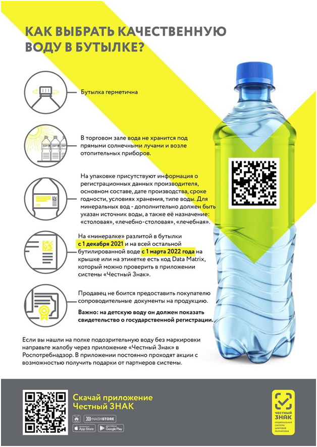 С 1 декабря 2021 года в России стартовала обязательная маркировка минеральной воды. С 1 марта 2022 года она распространяется на прочие категории питьевой воды, а это значит, что производители уже внедрили на своих производствах систему маркировки. Отсканировав цифровой код в мобильном приложении «Честный знак», можно проверить, кем и когда была произведена и упакована вода.
