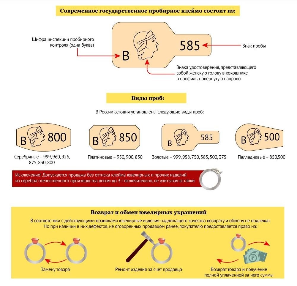 Продажа ювелирных изделий без оттиска государственных пробирных клейм Российской Федерации, а также оттисков именных изготовителей (для изделий Российского производства) не разрешается.
