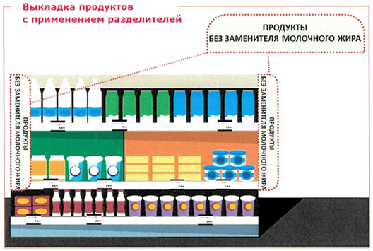 С 1 июля 2019 года вступил в силуПриказ Минпромторга России № 2098, Роспотребнадзора № 368 от 18.06.2019 «Об утверждении методических рекомендаций о рекомендуемых способах размещения (выкладки) молочных, молочных составных и молокосодержащих продуктов в торговом зале или ином месте продажи, позволяющих их визуально отделить от иных пищевых продуктов, а также о рекомендуемых способах сопровождения такой продукции информационной надписью "Продукты без заменителя молочного жира»