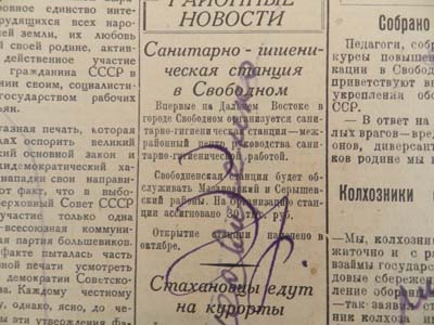 Почему именно в Свободном? На то были свои основания: в городе в те 30-е годы была разветвленная сеть сталинских лагерей, в которые были брошены безвинные люди, так называемые "враги народа". Здесь был центр дальневосточного ГУЛАГа. Условия содержания заключенных были из ряда вон выходящими, что служило возникновению инфекционных заболеваний. Инфекции не выбирают своих жертв, их колючей проволокой не за­держишь. Нависла угроза эпидемий. Контролировать данную ситуацию, по существу, было некому. Вот тогда-то и было принято решение о создании в городе санэпидстанции. До нас не дошли сведения о тех, кто в то время в ней работал, но в том, что массовое распространение инфекционных заболеваний не произошло, заслуга именно тех первых врачей и средних медработников.