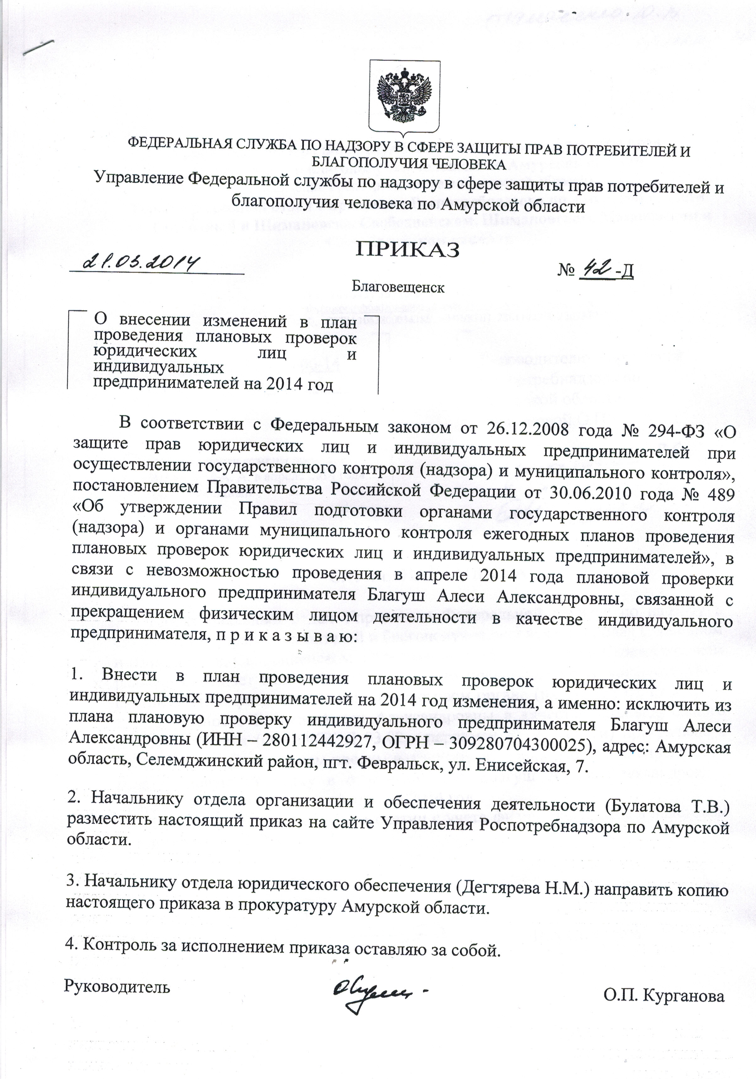 Приказ от 21.03.2014 № 42-Д "О внесении изменений в план проведения плановых проверок юридических лиц и индивидуальных предпринимателей на 2014 год"