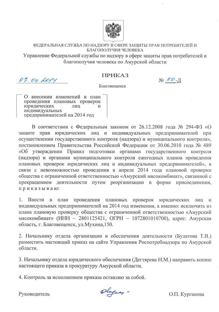 Приказ от 07.04.2014 № 50-Д "О внесении изменений в план проведения плановых проверок юридических лиц и индивидуальных предпринимателей на 2014 год"